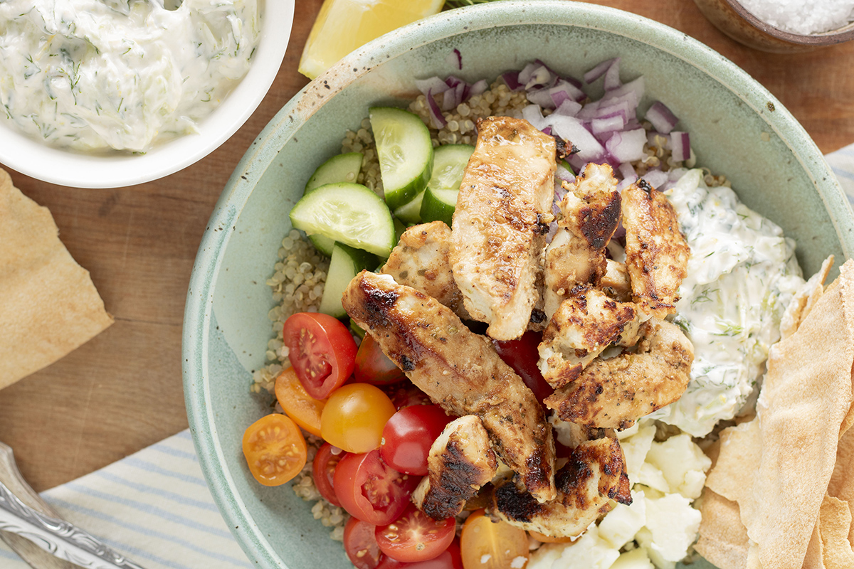 Ce bol de poulet à la grecque est l’une des recettes préférées de la famille de Marie-Hélène, co-propriétaire de la Boucherie Godin et fils, et on comprend vite pourquoi ! Savoureux, coloré et rapide à préparer, il est parfait pour les soirs de semaine où l’on veut bien manger sans passer des heures en cuisine.
