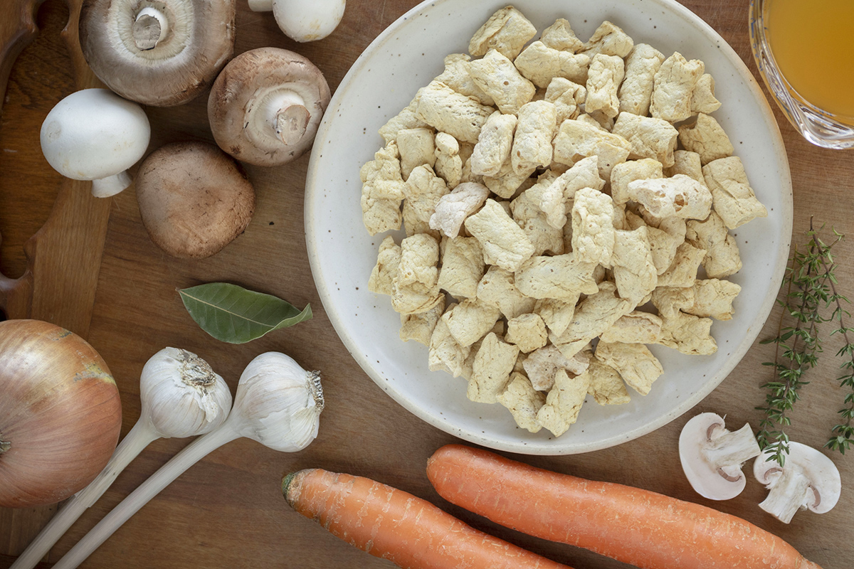 - 1 ½ tasse de protéine végétale en morceaux