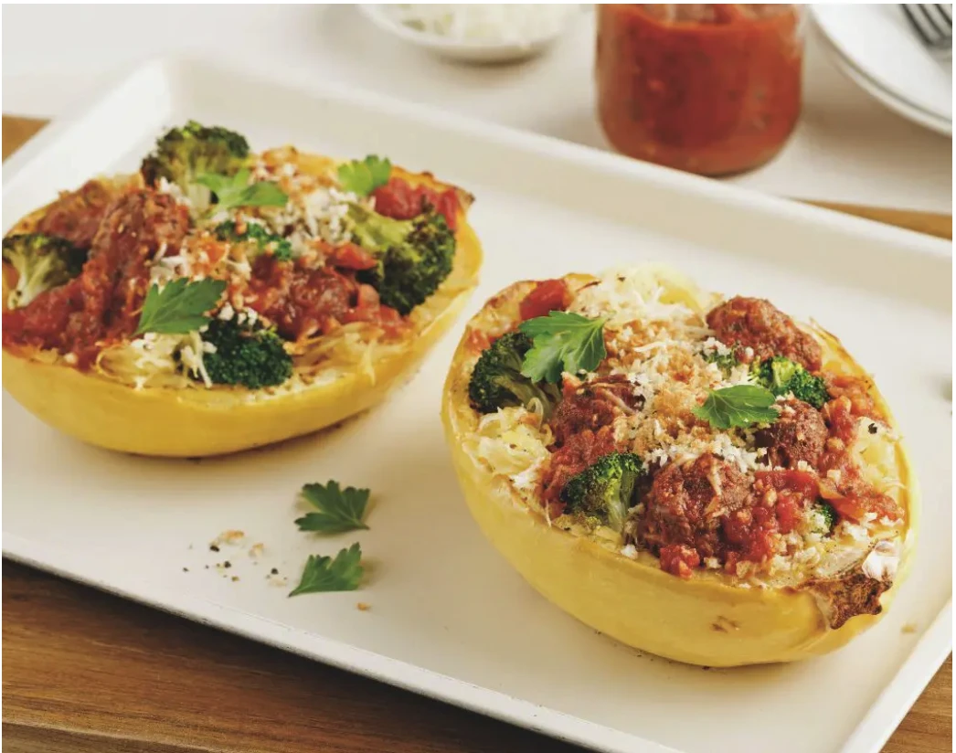 - Verser la préparation à la sauce sur les demi-courges spaghetti. Garnir de parmesan et de chapelure. Poursuivre la cuisson au four de 15 à 20 minutes.